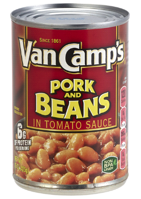Van Camp's Pork & Beans are simmered in vine-ripened tomato sauce and a special blend of spices. They have 6 grams of protein per serving. Use these canned beans in baked beans or plain as a simple side dish. Heat in the microwave or on the stove top. Store the can of beans in your pantry. Van Camps has been making delicious beans for more than 140 years.